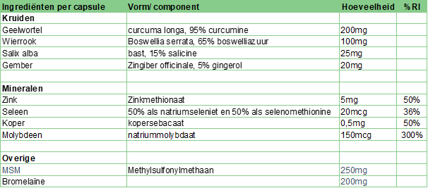 Kruiden, mineralen, methylsulfonylmethaan, bromelaïne, capsule (hydroxypropylme-thylcellulose), vulstof (microkristalline cellulose, L-leucine).