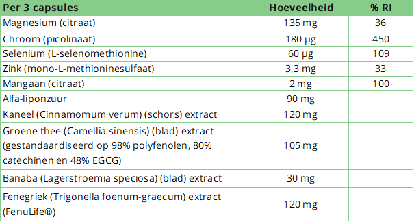 Mineralen, Vulstoffen (Microkristallijne cellulose, Gefermenteerde leucine, Rijstconcentraat), Kruiden, Capsulewand (Hydroxypropylmethylcellulose), Alfa-liponzuur.